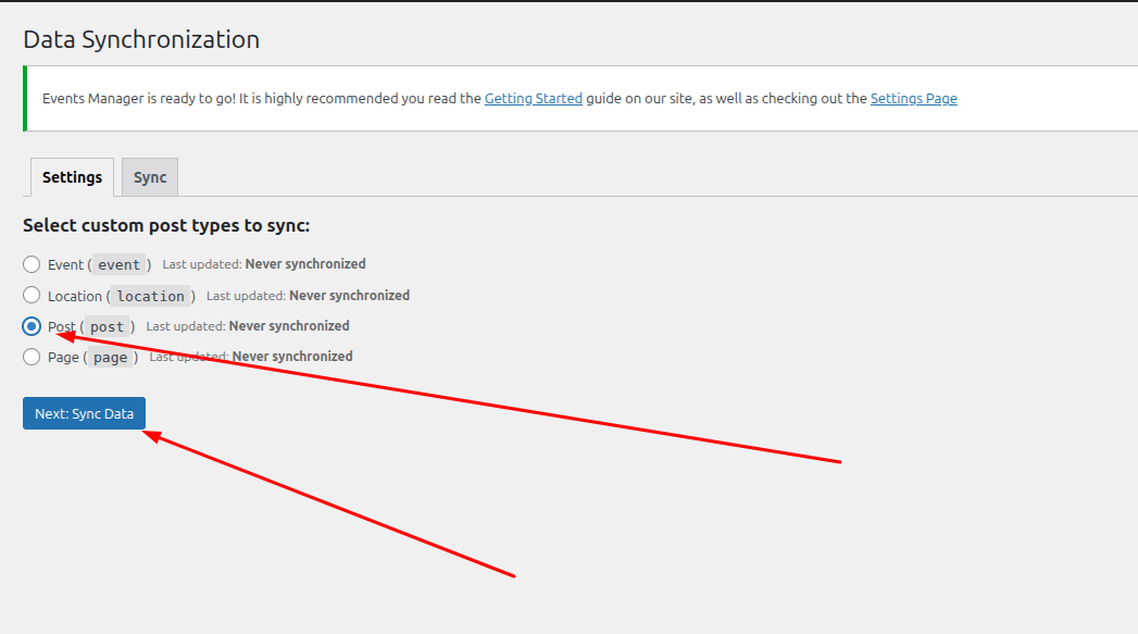 2\. Under “Select custom post types to sync”, choose the post type(s) you want to include and click “Next”.