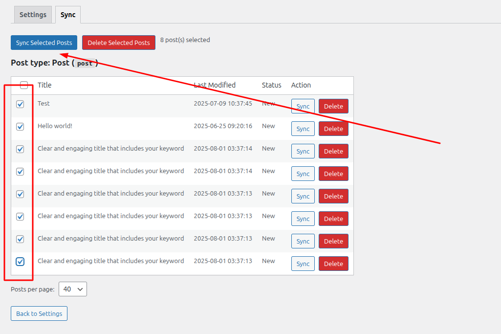3\. Select specific posts or pages you want to sync, then click “Sync Selected Posts”.