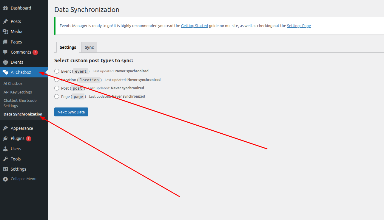 1\. In your WordPress Dashboard, go to “AI Chatboz” → “Data Synchronization”.